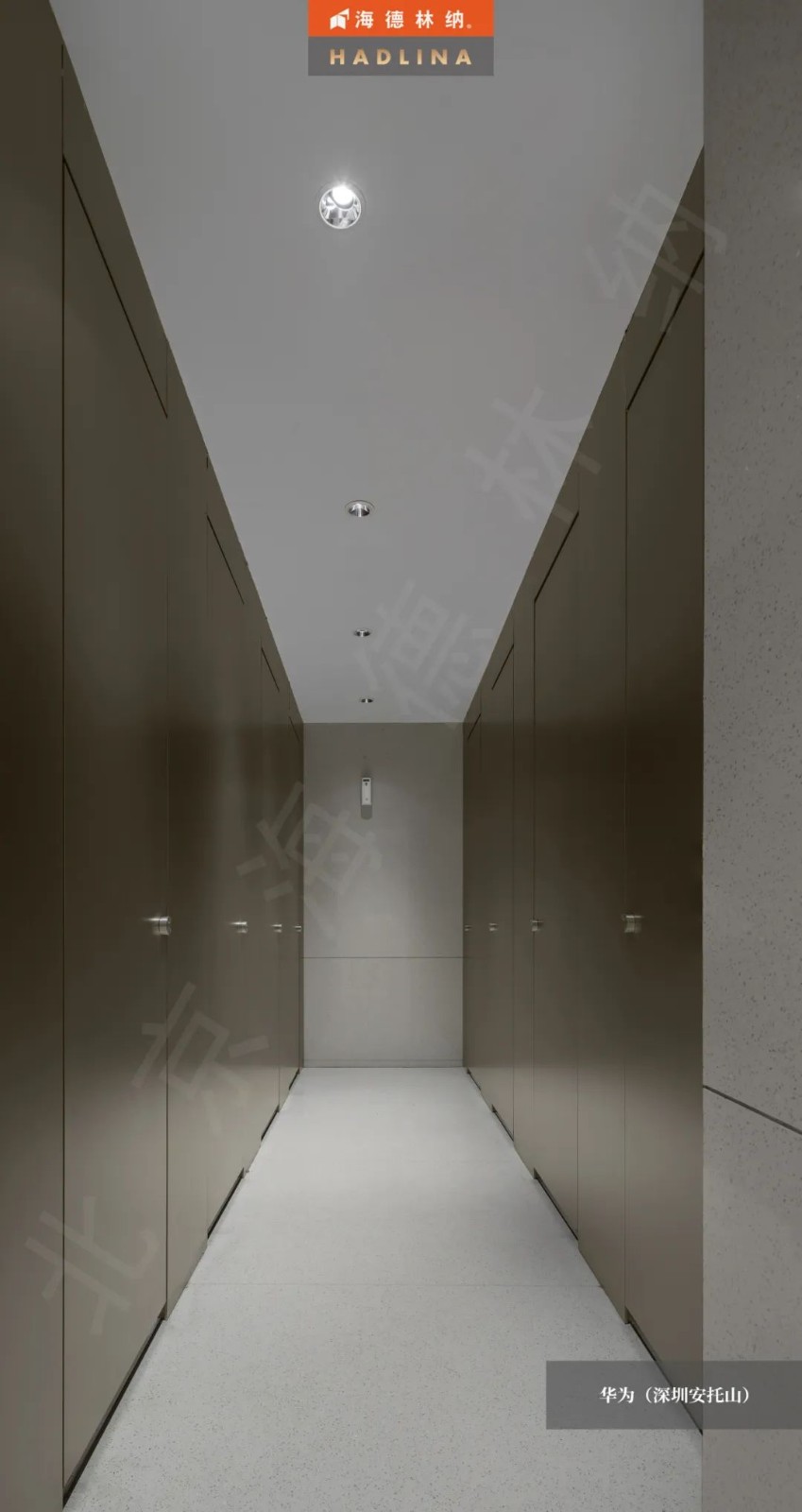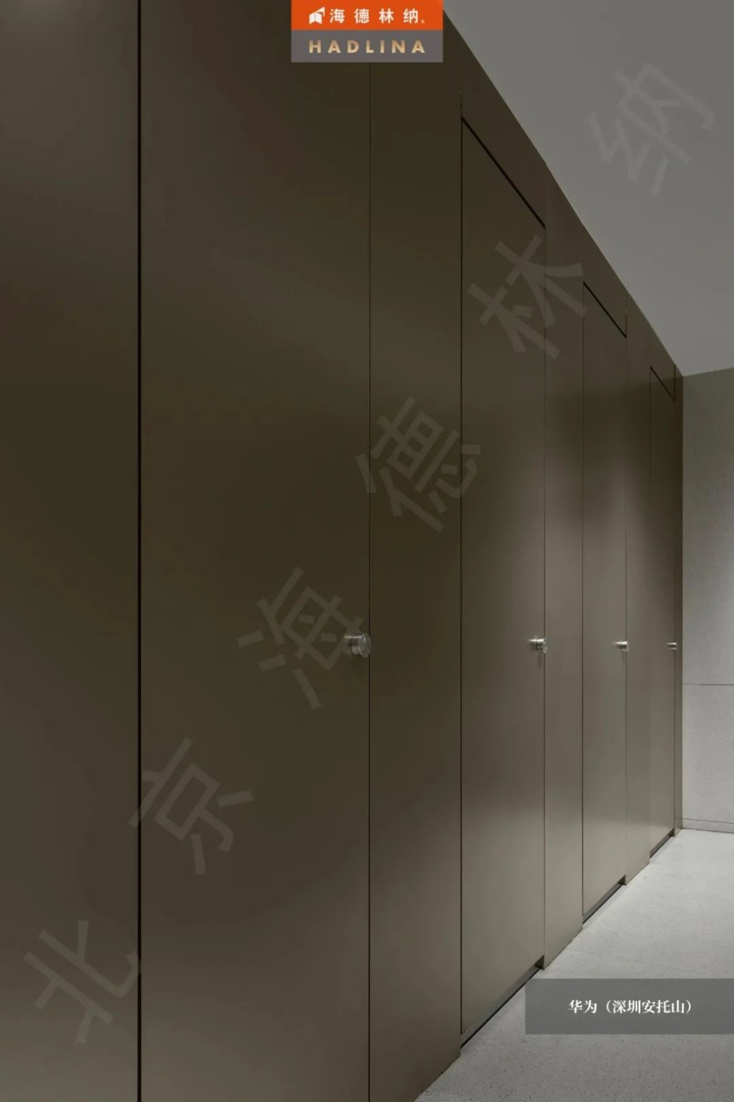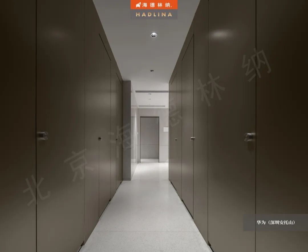 華為(深圳安托山)項目采用36mm厚度的香檳金不銹鋼板材,擁有優異硬度和強度,既有良好的防撞性能,能有效抵抗外力沖擊。A級防火,能有效隔離熱源和阻止火勢蔓延,提高公共衛生空間的安全性。不銹鋼的材質具有優秀的耐腐蝕特性,能夠抵抗濕氣、污漬和化學物質的侵蝕,擁有極長的使用壽命。