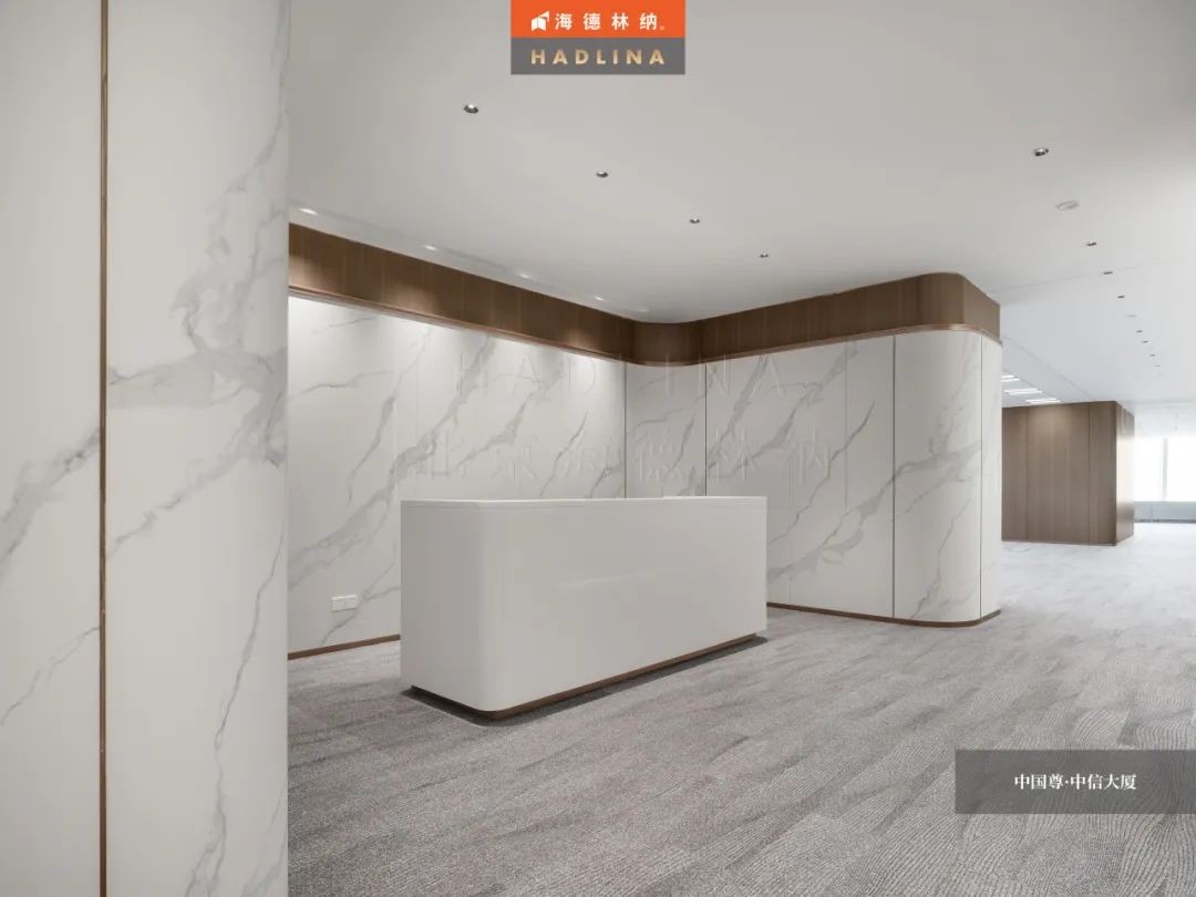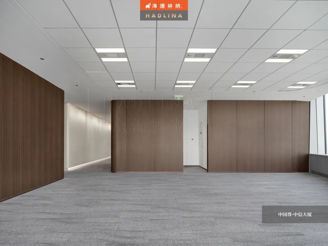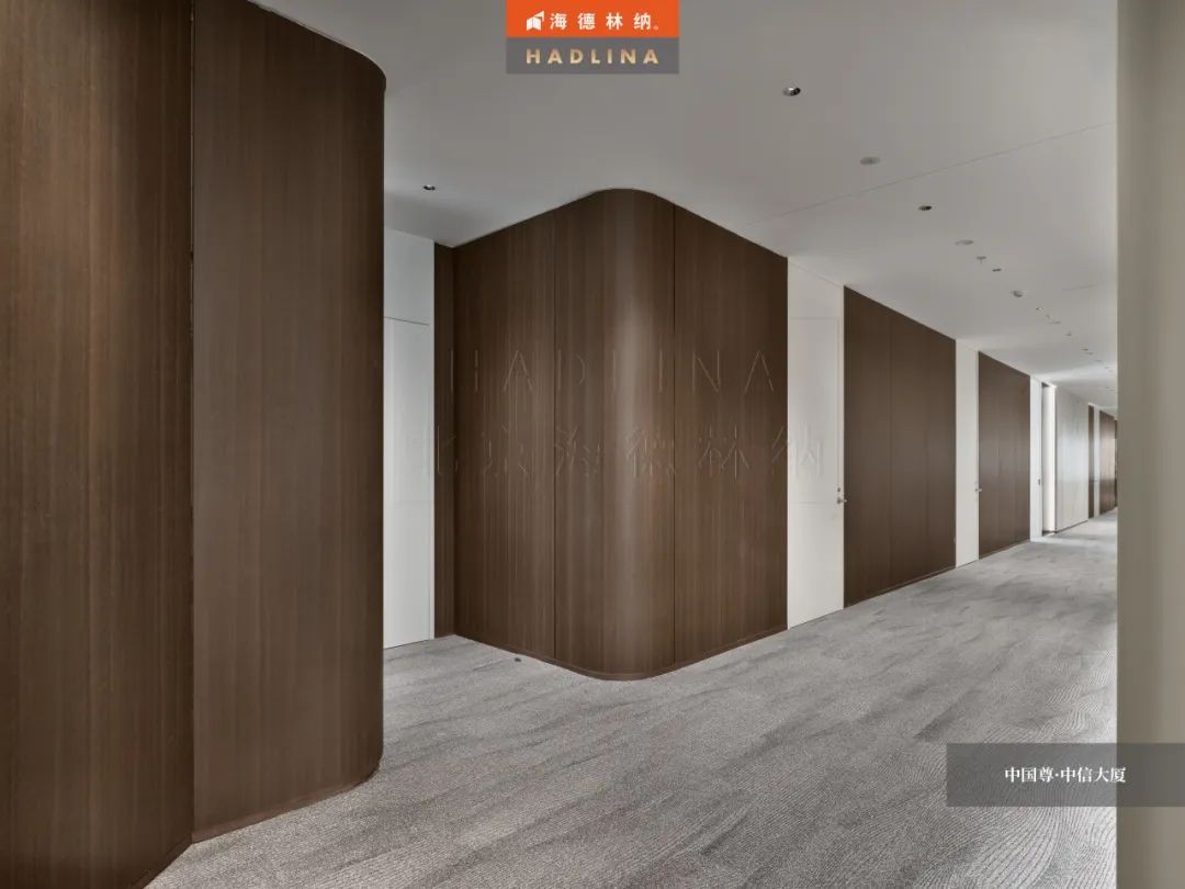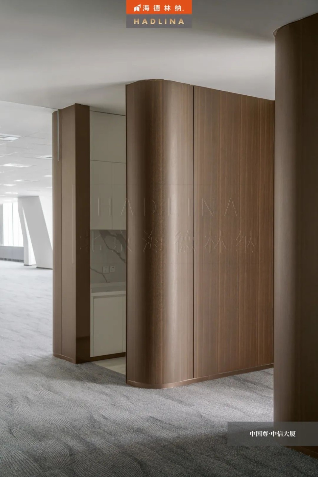 中國尊/中信大廈裝配式掛墻系統主要選用海德林納?木紋/布紋為主要顏色,將色彩與空間完美結合,給人帶來一種溫暖、自然的感受。色彩的選擇與搭配讓整個空間更加和諧統一,營造出舒適宜人的氛圍。為人們提供了愉悅的視覺享受,讓人沉浸在自然的溫暖與寧靜之中。